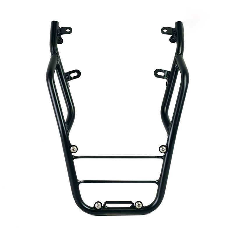 Gepäckträger aus Stahlrohr mit mattschwarzer Epoxidpulverbeschichtung. Er schließt das Heck ab und ist mit Haltegriffen für den Beifahrer ausgestattet. Es wird ganz einfach an den 4 von Ducati vorgesehenen Befestigungspunkten am Fahrradrahmen befestigt. Es ist mit 4 Buchsen zur Befestigung der Taschenhalterungen Code 1007 ausgestattet.