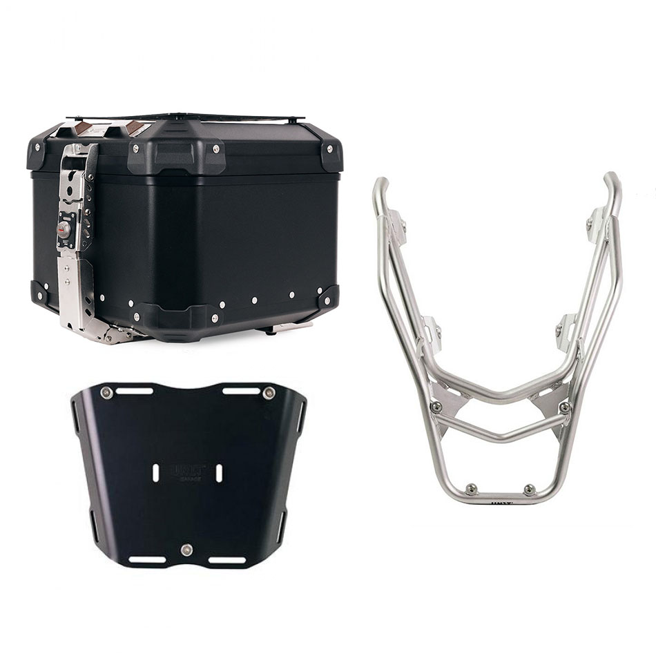 Die aus 5 mm dickem, eloxiertem Aluminium gefertigte Halterung ermöglicht die Montage unseres ATL3 Topcases auf verschiedenen Gepäckträgern. Motorrad-Montagesysteme (z. B. Artikelnummer A9) sind nicht im Lieferumfang enthalten und müssen separat erworben werden.