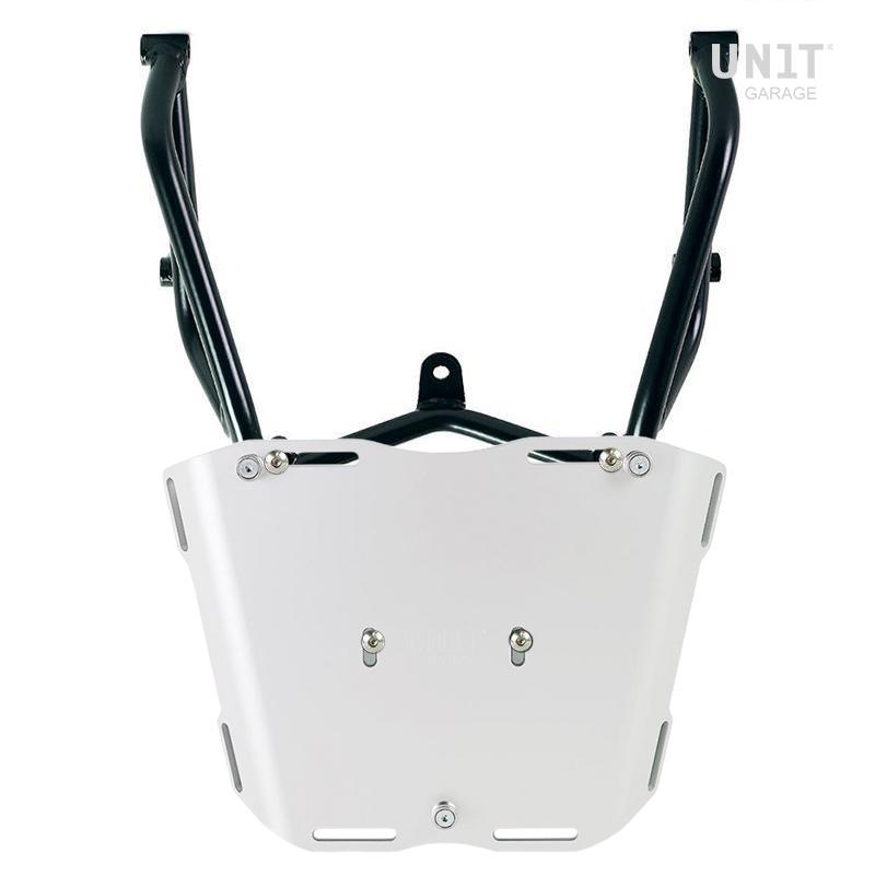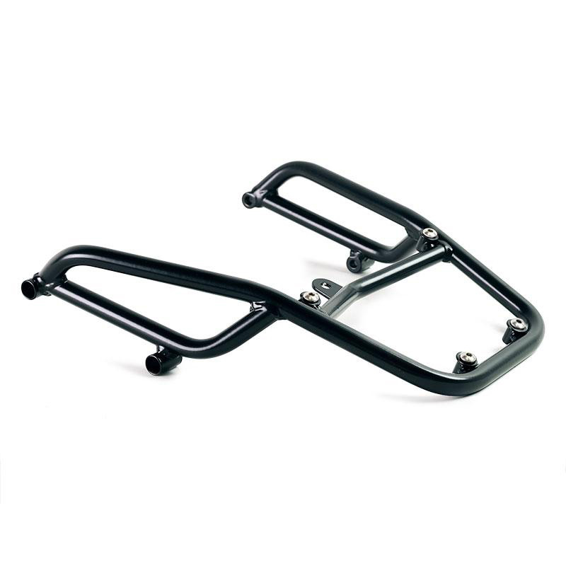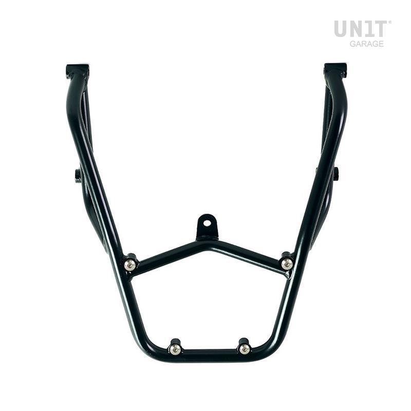 Gepäckträger aus Stahlrohr mit mattschwarzer Epoxidpulverbeschichtung. Es vervollständigt den hinteren Teil und ist mit Griffen für den Sozius ausgestattet. Mit den mitgelieferten Schrauben kann es sehr einfach am Originalmotorrad befestigt werden. Robust und praktisch, ist es auf der Auflagefläche mit 4 Buchsen zur Befestigung der Platte Code: AL5 ausgestattet.