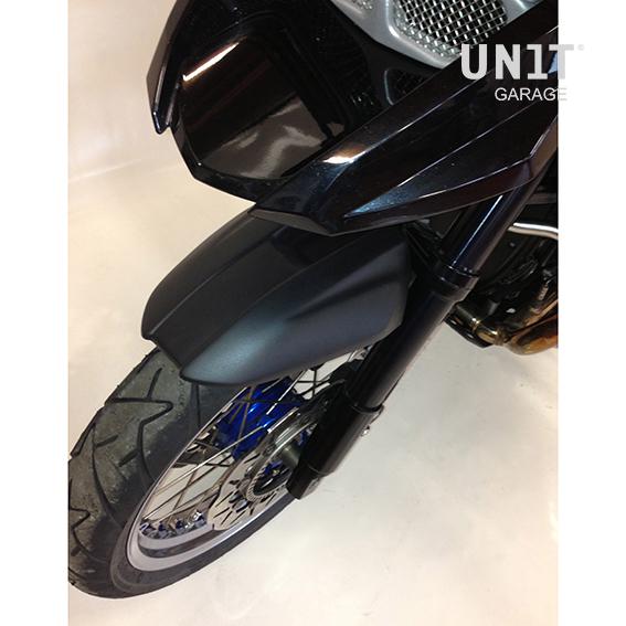 Fender in Mattschwarz für vorne, hergestellt aus Kunstharz und anschließend kohlefaserverstärkt. In zwei Farben erhältlich. Das Schutzblech wird montagefertig geliefert und ist für die Befestigung an der Originalgabel vorgesehen.