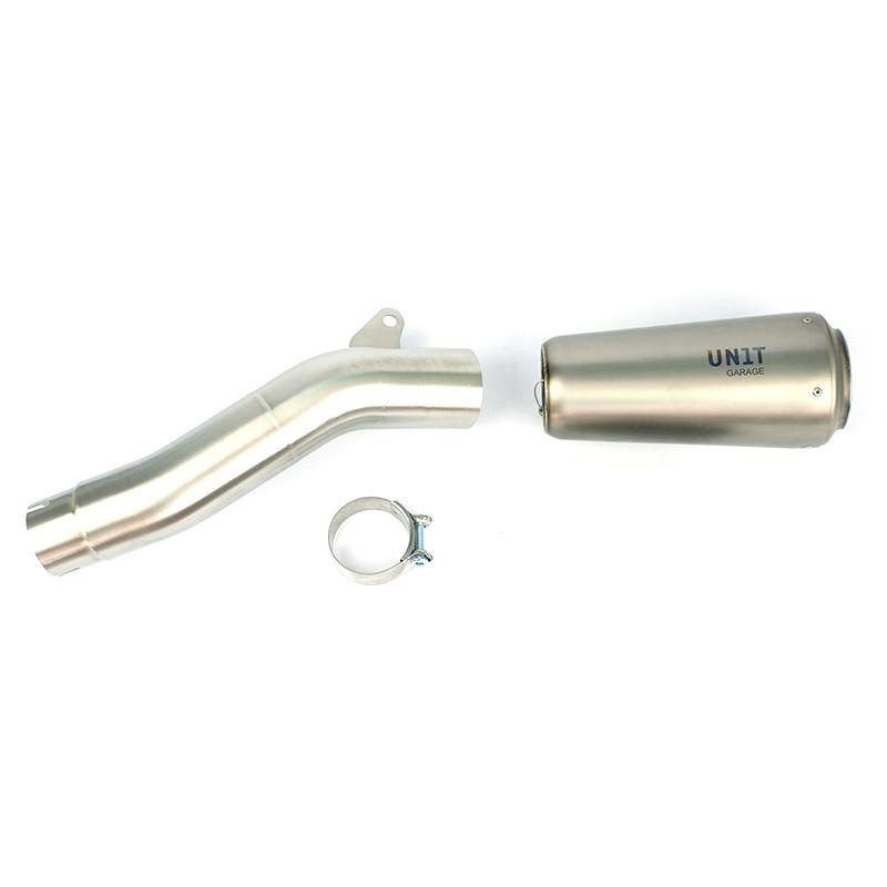 Titan-Schalldämpfer und Edelstahl-Armaturen, vollständig von Hand gefertigt, im perfekten Moto-GP-Stil.