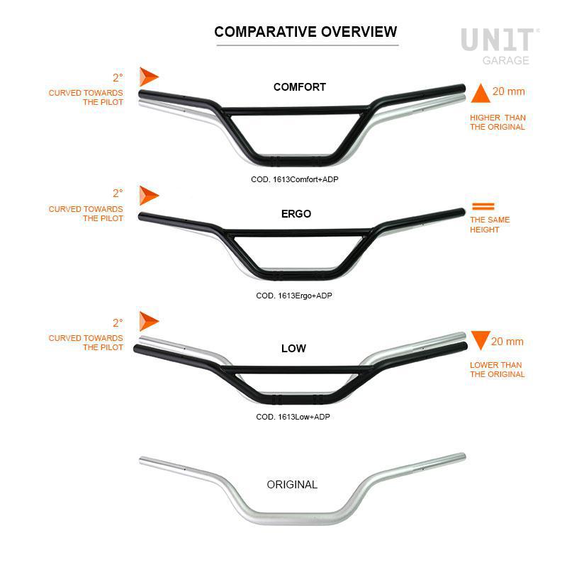 Der niedrige Lenker 1613 ist niedriger als der Originallenker und hat eine bequemere Biegung (siehe Maße im Datenblatt).