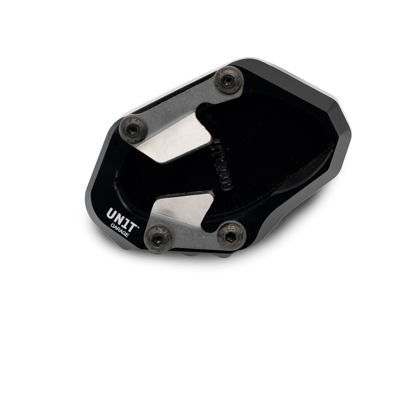 Die Auflagefläche des Originalständers ist recht schmal. Auf weichen Oberflächen oder heißem Asphalt bietet diese aus Ergal gefräste Platte einen sicheren Stand. Rostfreie, schwarz eloxierte Oberfläche mit Gravur und Logo. Die Montage ist in wenigen Minuten erledigt.