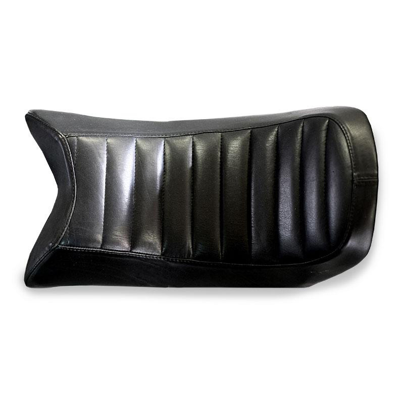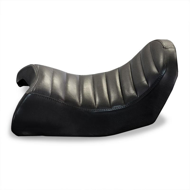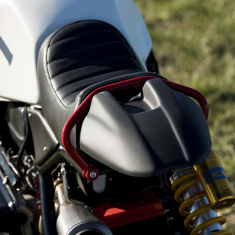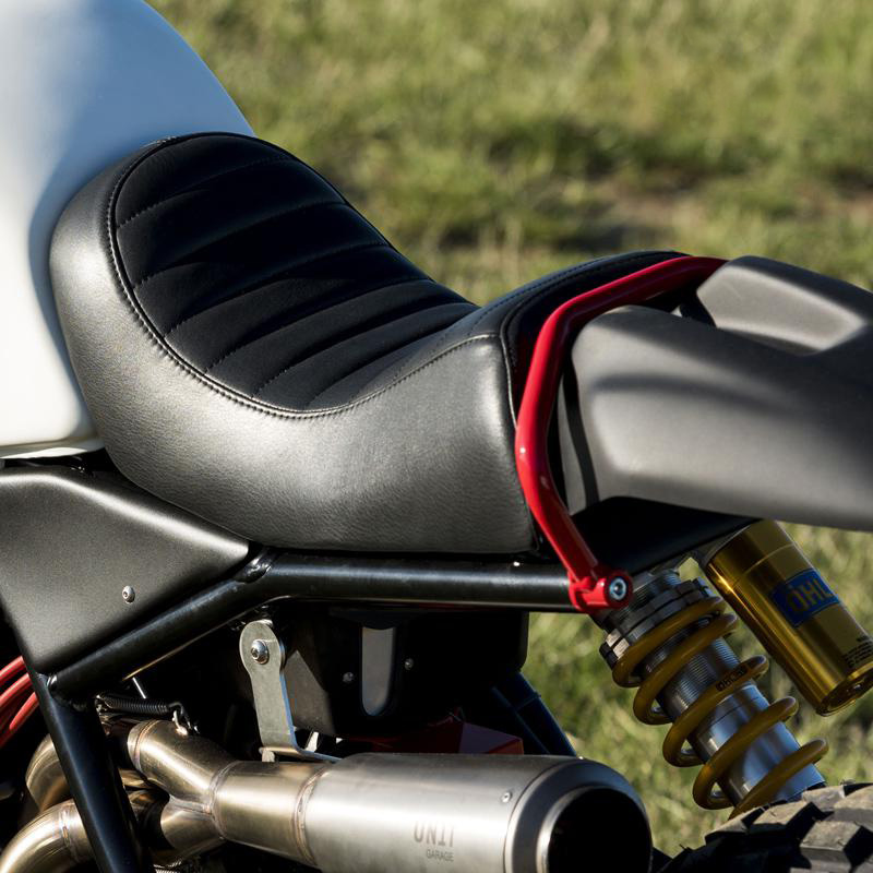 Sitzbank aus echtem Leder. Für das Material wählten wir die landesweit besten Gerbereien aus. Alle Bezüge sind italienischer Herkunft und wurden nicht mit Pentachlorphenol behandelt. Sie werden von Hand gefertigt und mit dem Baumwollfaden genäht. Die Sitzbank wurde für den Sitzkomfort mit einem extrem leichten Gelkissen ergänzt. Für den Einbau müssen keinerlei Modifikationen vorgenommen werden, sie passt ohne Umbauten an das Motorrad. Ausgestattet mit einer speziellen Hakenhalterung an unserem Rahmen sowie Befestigungsvorrichtung für den hinteren Kotflügel.