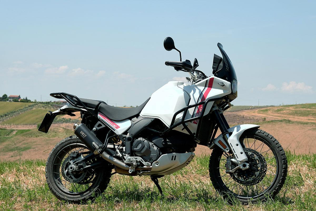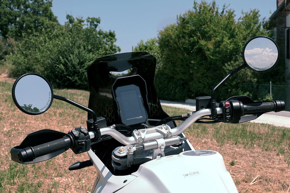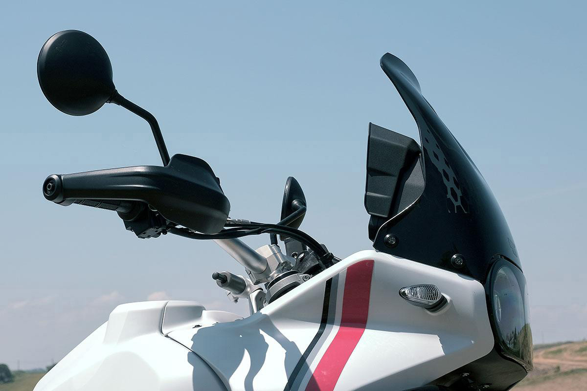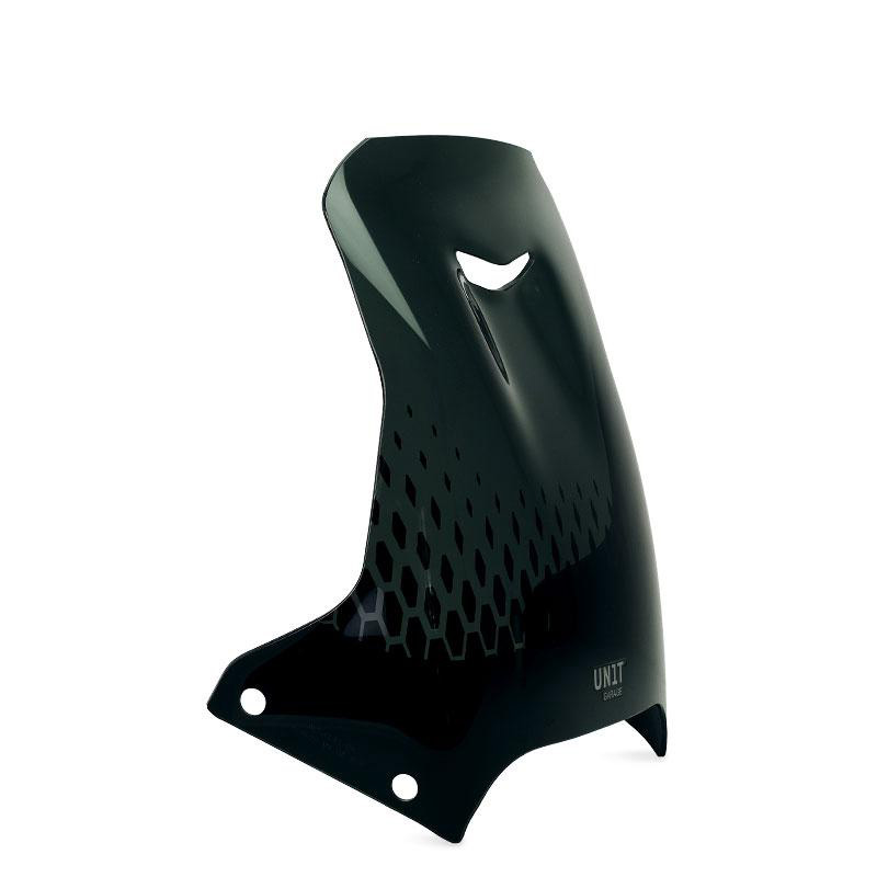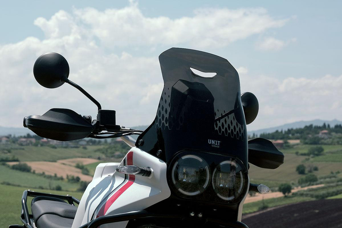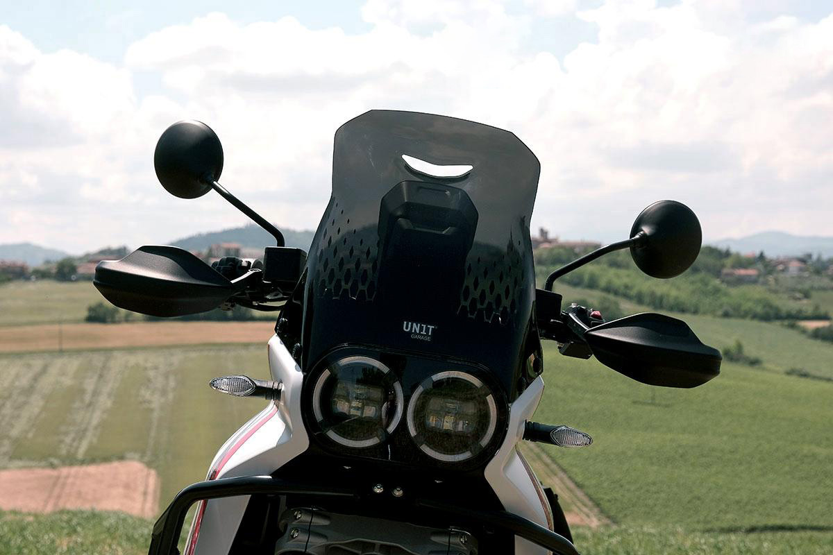 Die DesertX Edi Sport-Verkleidung ist so konzipiert, dass sie ohne Änderungen unter Wiederverwendung der Originalstützen montiert werden kann. Die Ergonomie der Verkleidung ist absolut individuell und wir haben sie in verschiedenen Formen, Größen und Transparenzen entwickelt, die jeweils für unterschiedliche Körpergrößen und Erwartungen geeignet sind. In dieser Version, dem Durchschnitt der drei Vorschläge, haben wir ähnliche Abmessungen wie das Original beibehalten, jedoch mit einer schützenderen Form und einem zusätzlichen zentralen Lufteinlass, der den Luftstrom kontrollierter leitet. Es besteht aus 4 mm dickem PMMA und ist sowohl transparent als auch rauchfarben, beide mit Siebdruck, erhältlich. Es bietet nicht nur mehr Schutz, sondern harmoniert auch perfekt mit dem Design des Fahrrads. Es wird komplett mit Schrauben und Befestigungseinsätzen aus schwarz eloxiertem Ergal geliefert, die Originalgummis müssen wiederverwendet werden.