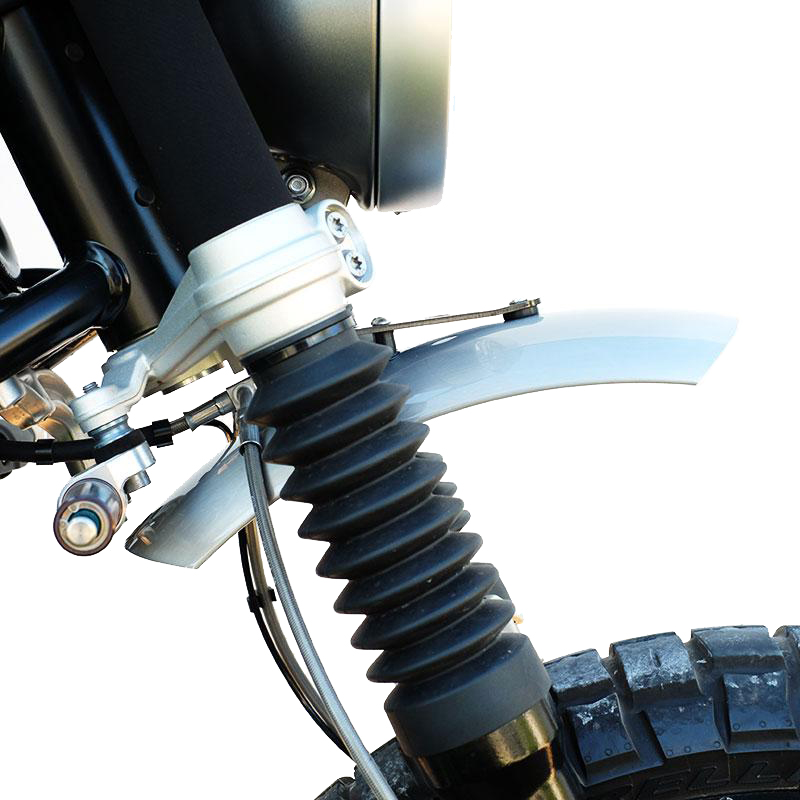 Es ersetzt den gesamten originalen vorderen Kotflügel, im perfekten „Old School“-Stil. Es ist mit einer Stahlhalterung zur Befestigung an der Scheinwerferhalterung ausgestattet, mit mattschwarzer Epoxidpulverbeschichtung. Komplett mit vorderem Kotflügel aus satiniertem Aluminium mit transparenter Lackierung.