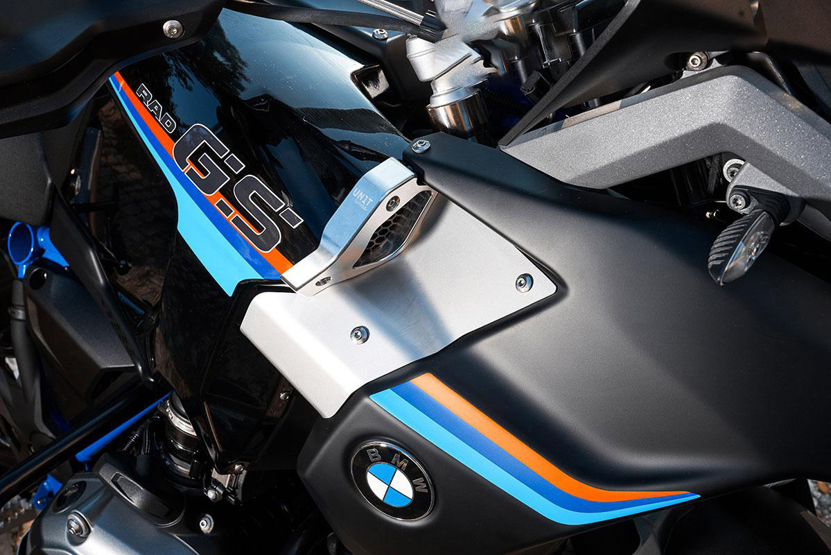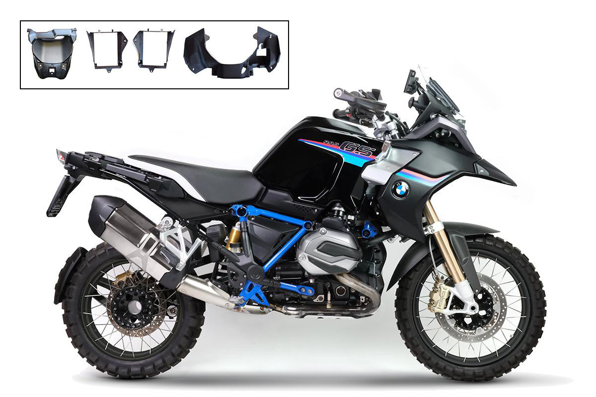 Gestaltet die gesamte Vorderseite des Fahrrads neu und macht es schmaler und verjüngt. An den Seiten befindet sich das Gehäuse des originalen R1200 GS Logos, das von Deinem Bike abgenommen werden kann. Zwei vorgestanzte Aufkleber werden mitgeliefert, um die Logos zu ersetzen, die Sie zerlegen möchten.