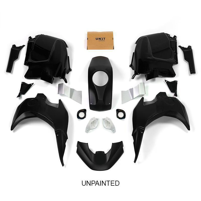 Gestaltet die gesamte Vorderseite des Fahrrads neu und macht es schmaler und verjüngt. An den Seiten befindet sich das Gehäuse des originalen R1200 GS Logos, das von Deinem Bike abgenommen werden kann. Zwei vorgestanzte Aufkleber werden mitgeliefert, um die Logos zu ersetzen, die Sie zerlegen möchten.
