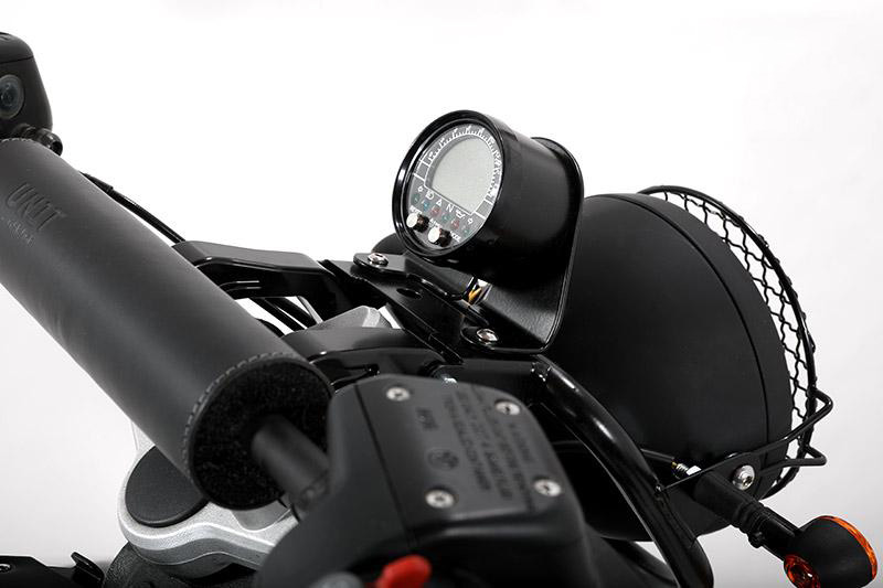 Bestehend aus allem, was für die Montage erforderlich ist, einschließlich der Befestigungshalterung an unseren Scheinwerferrahmen und dem Ring für das Instrument. Computer mit Gehäuse und schwarzem Rahmen Abmessungen: Durchmesser 73 mm - Höhe 41 mm. Drehzahlmesser und Geschwindigkeitsanzeige bis 300 km/h; Teil- und Gesamtkilometerzähler, Zeit, Höchstgeschwindigkeit, Teil- und Gesamtfahrzeit; LCD-Display mit zwei digitalen Zeilen und einem analogen Balkendiagramm für den Drehzahlmesser; LCD-Display mit blauem LED-Hintergrund; Speicherung von Kilometerstand und Gesamtstrecke; Zeitanzeige auch bei ausgeschaltetem Gerät; Radumfangseinstellung anpassbar an alle Radtypen (1-3999 mm breit); Maßeinheit der Geschwindigkeit in Meilen oder Kilometern; Wasserdichte Hülle; Fahrtrichtungsanzeiger, Lichter, Öldruck, Neutralanzeige und Motorfehler; Balkendiagramm-Kraftstoffanzeige. Im Lieferumfang enthalten ist ein Geschwindigkeitssensor mit Magnet; Befestigungssatz und Halterung komplett aus rostfreiem Aluminium; Verkabelung mit wasserdichten Zinnanschlüssen; Aufbauanleitung und Handbuch.
