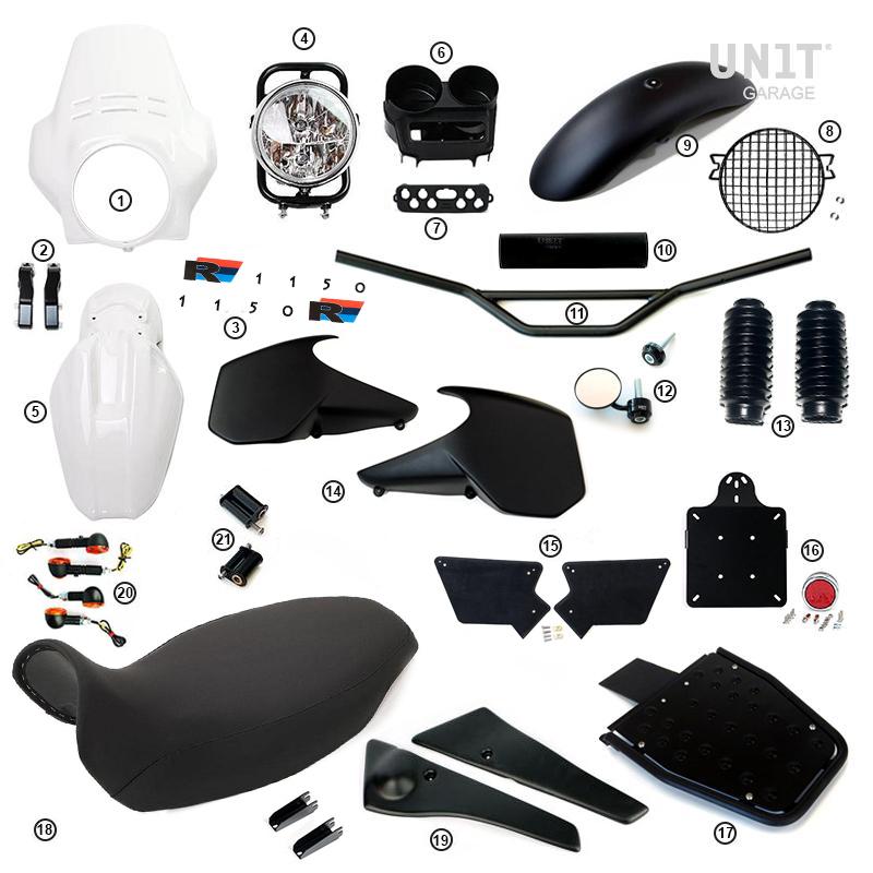 Der vordere Kotflügel ist im Kit in zwei Farben erhältlich. Sie greift die Linienführung der GS-Zehenkappe aus den 80er-Jahren auf, mit einem Finish in Alpinweiß, Mattschwarz oder Rot; Die Montage erfolgt einfach durch Befestigung in den speziellen Halterungen des Frontleuchtenrahmens Code: 1216.