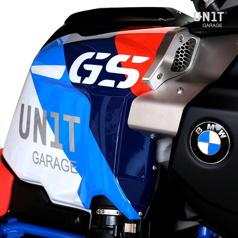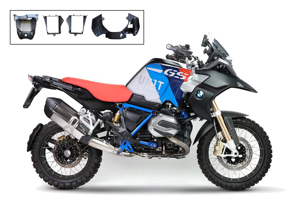 Gestaltet die gesamte Vorderseite des Fahrrads neu und macht sie schmaler und konischer. An den Seiten befindet sich das Gehäuse des originalen R1200 GS-Logos, das von Ihrem Fahrrad entfernt werden kann. Zwei gestanzte Aufkleber werden mitgeliefert, um die der Logos zu ersetzen, die Sie zerlegen werden.