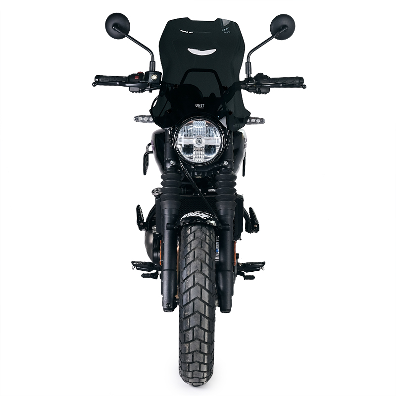 In dieser größeren Version haben wir den aerodynamischen Schutz weiter implementiert. Komplett mit neuer Halterung und Schrauben, passt es stilistisch perfekt zu den Linien der Front. Hergestellt aus 4 mm dickem PMMA (Acryl). Der Zusammenbau ist sehr einfach. Die vordere Entlüftung verhindert Turbulenzen und das Stützrohr dient gleichzeitig als GPS- oder Mobiltelefonhalter.