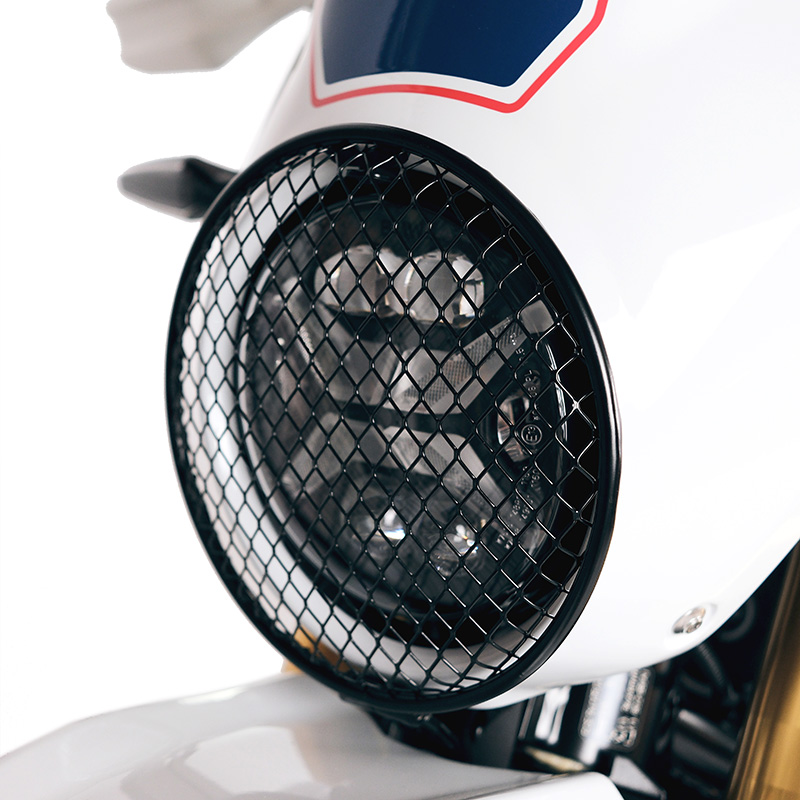 Handgefertigter Kühlergrill im perfekten Dakar-Stil der 80er Jahre, mit einer hochbeständigen Pulverbeschichtung behandelt, lässt sich zum Reinigen des Scheinwerfers schnell abnehmen.