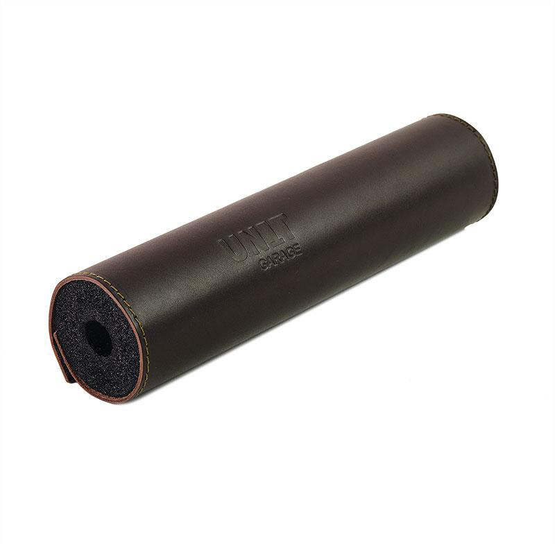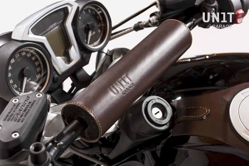 Der Stoßfänger aus braunem Leder lässt sich sehr leicht an jeder Lenkerquerstange befestigen und schützt das Gesicht bei einem Sturz.
