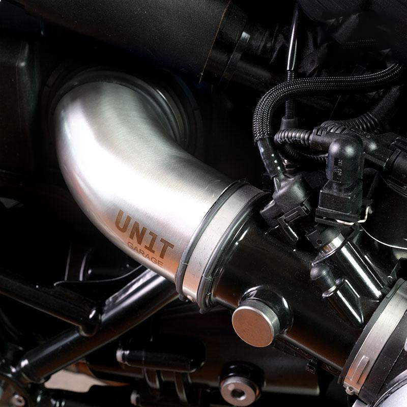 Paar Ansaugkrümmer aus satiniertem Edelstahl, rechts und links, mit Unit-Garage-Logo.