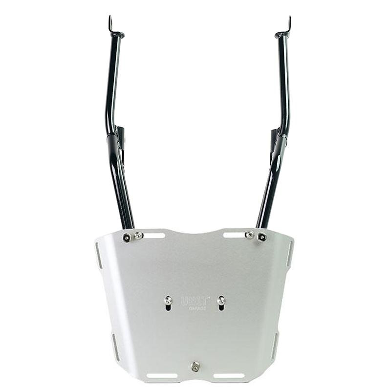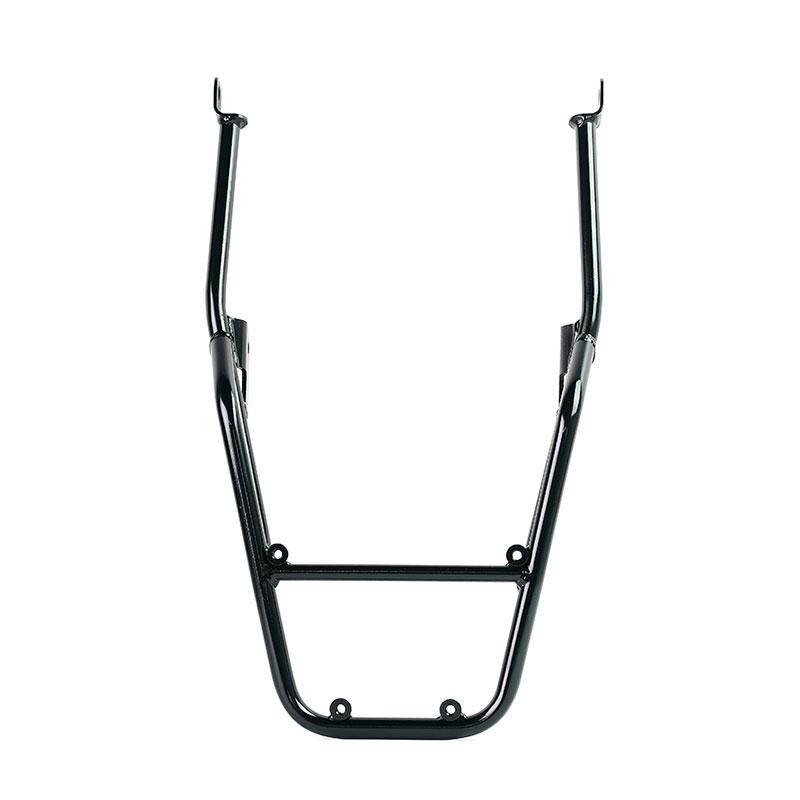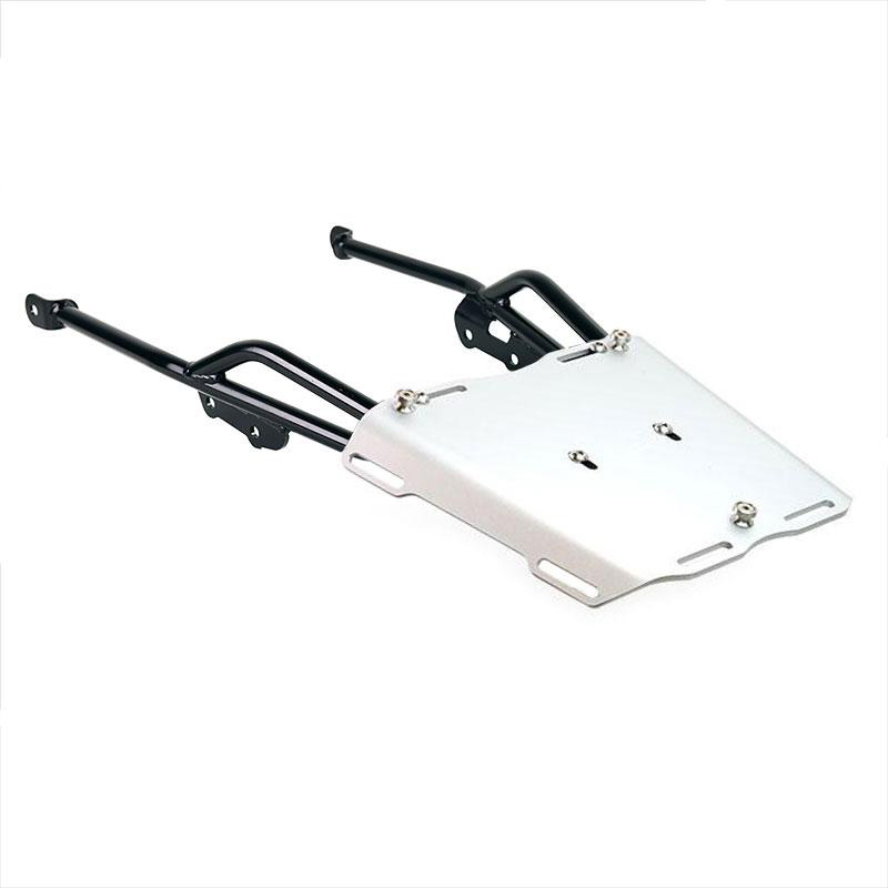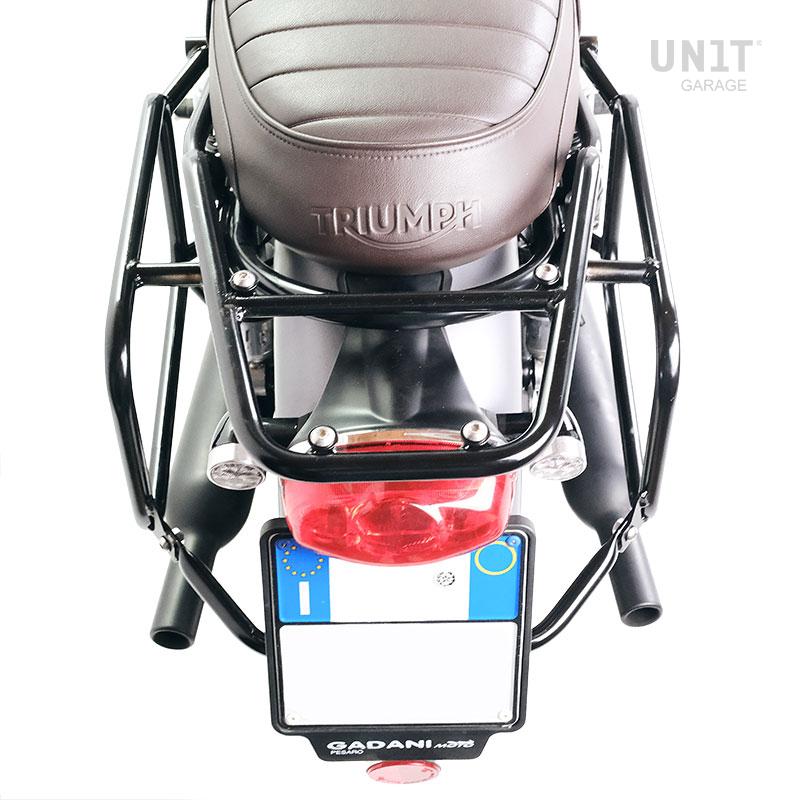 Der Gepäckträger aus Stahlrohr mit mattschwarzer Epoxidpulverbeschichtung vervollständigt den hinteren Teil und ist mit Griffen für den Beifahrer ausgestattet. Die Befestigung am Originalmotorrad ist kinderleicht. Robust und praktisch, verfügt er auf der Auflagefläche über vier Buchsen zur Befestigung der AL5-Platte (separat erhältlich oder bereits im Atlas-Kofferraumcode Bundle enthalten).