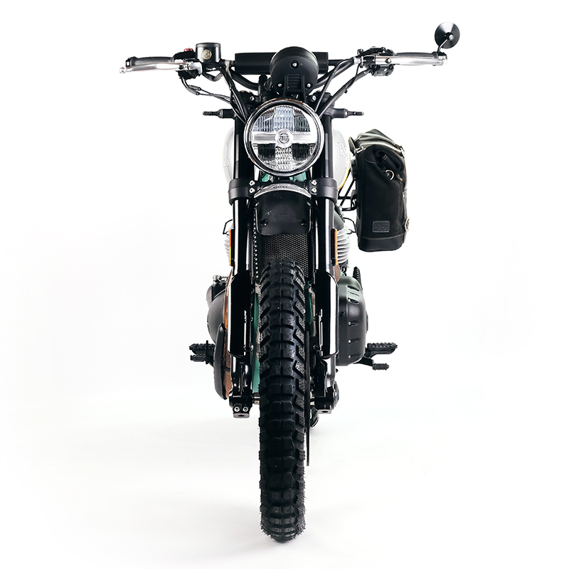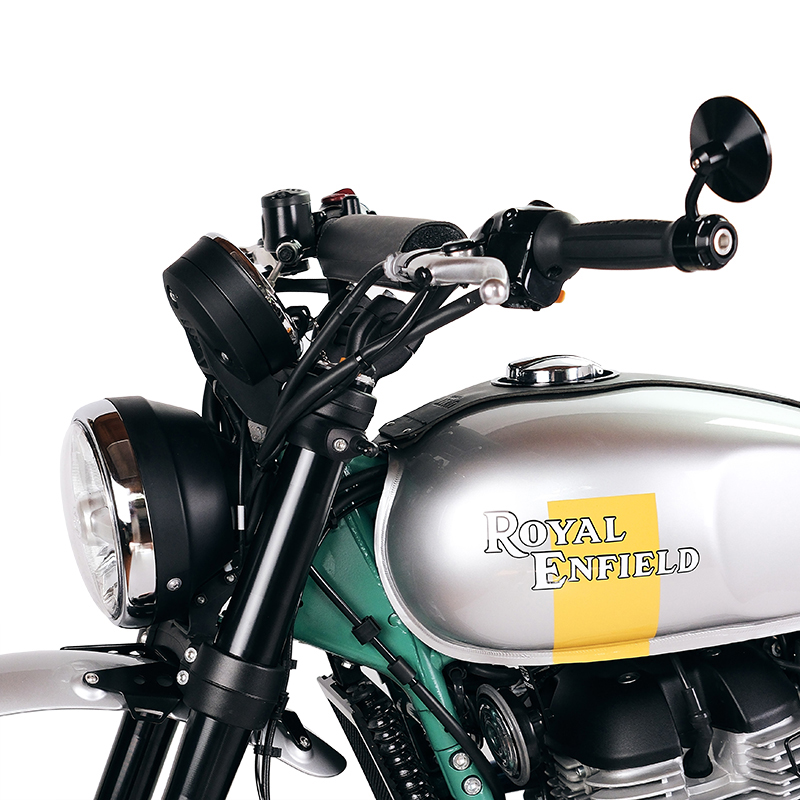Stahllenker speziell für die Royal Enfield Bear 650. Er lässt sich an den originalen Risern montieren. Alle Züge (Gas, Bremse, Kupplung und Verkabelung) müssen nicht ausgetauscht werden. Er ist mit vorgebohrten Löchern zur Befestigung der originalen Steuerblöcke und M6-Gewindeeinsätzen zur Aufnahme der Gegengewichte ausgestattet.