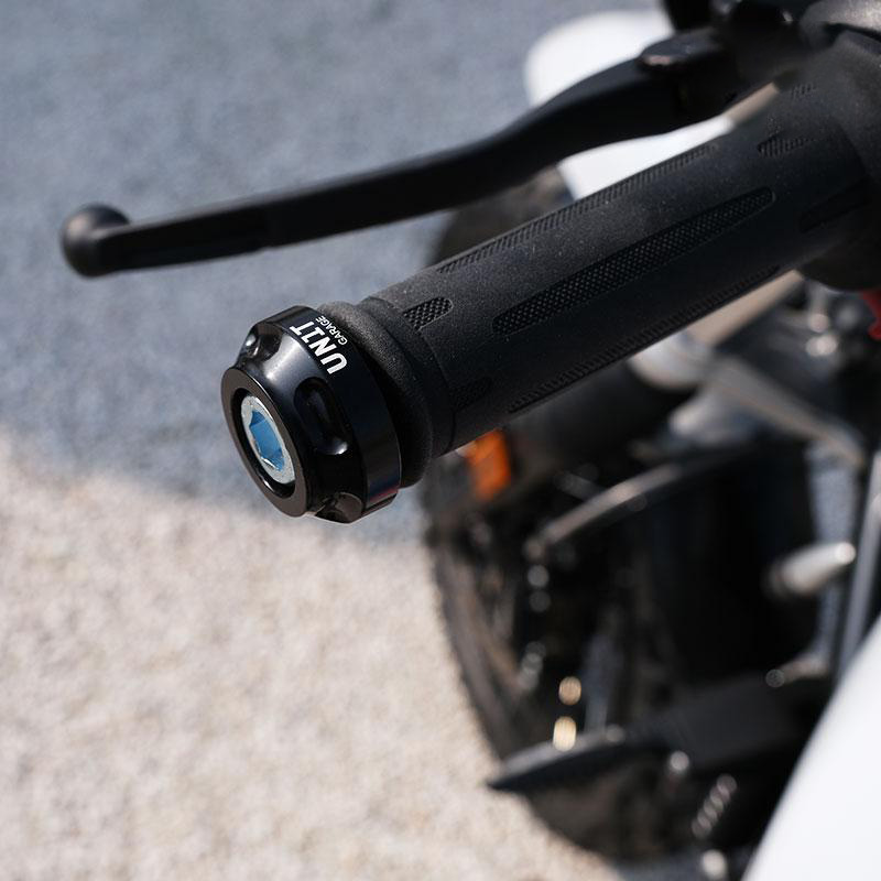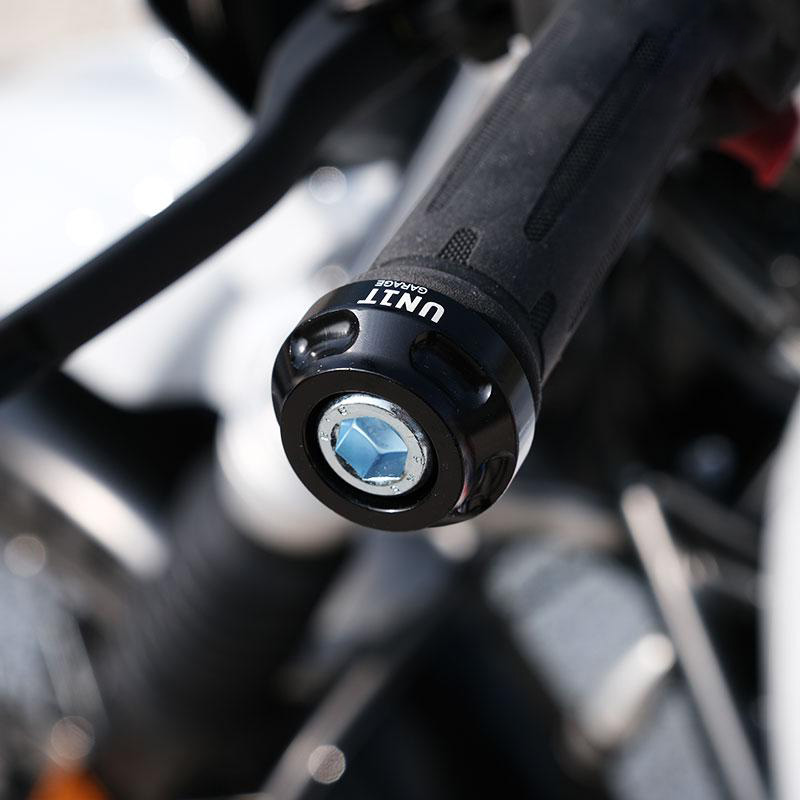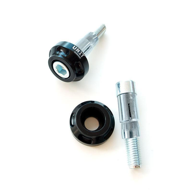Paar CNC-gefertigte Lenkerenden mit schwarz glänzendem Finish und Unit Garage-Logo. Die beiden M12-Schrauben mit relativer Befestigungsexpander sind im Lieferumfang enthalten.