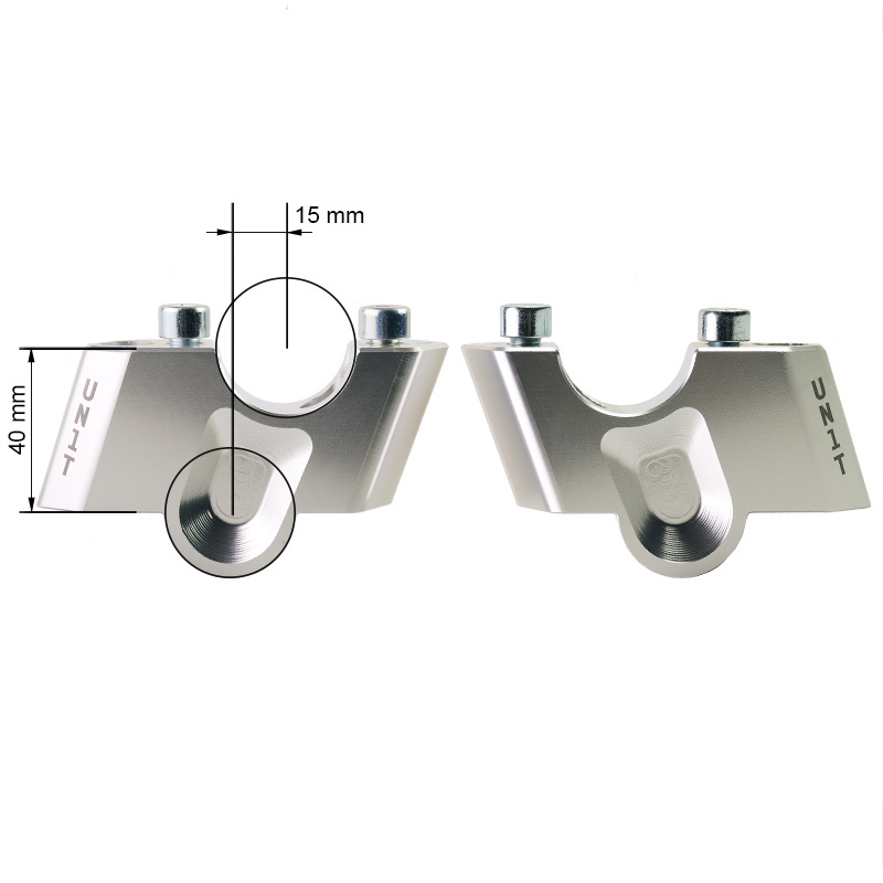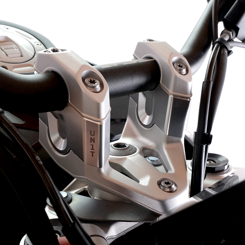 Von uns entworfene und CNC-gefertigte, spezielle Lenkererhöhungen, gefertigt aus einer massiven Aluminiumlegierung mit silbernem Finish.
