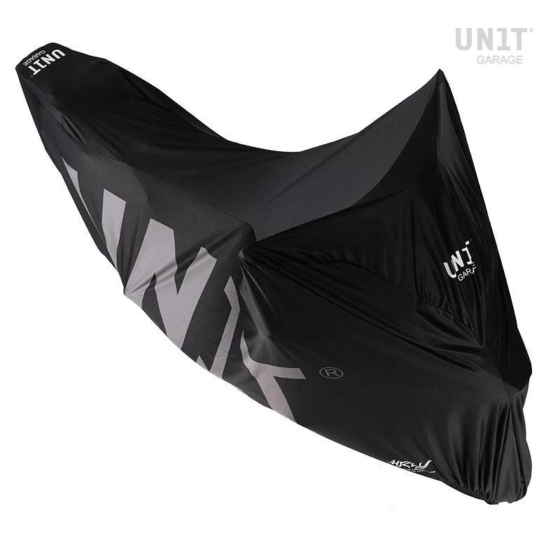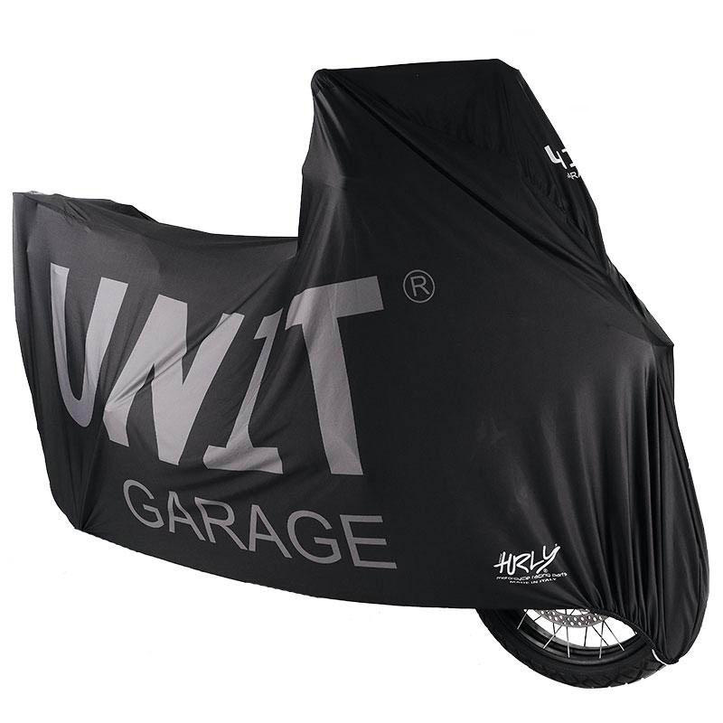 Schützt das Motorrad vor Staub und Schmutz mit Unit-Garage-Logo.