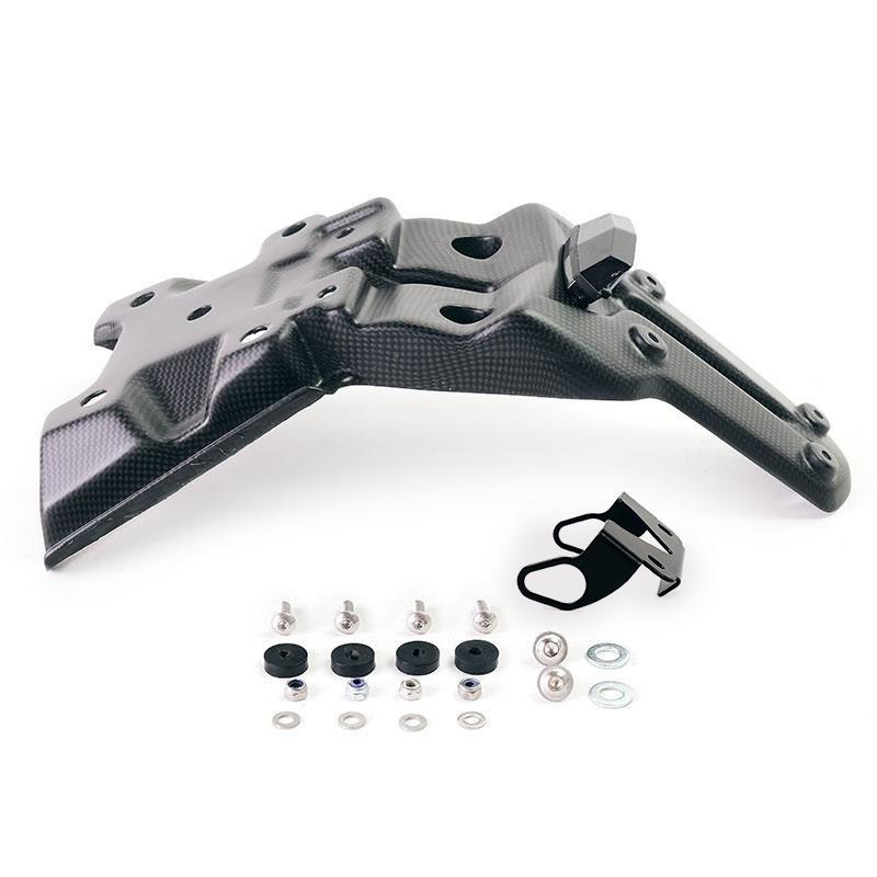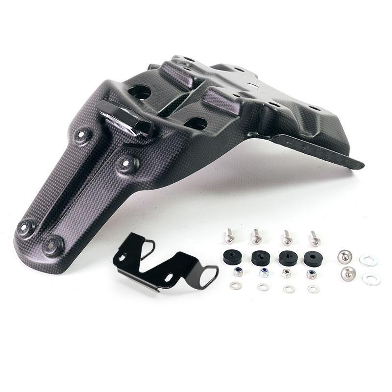 Leichter Kennzeichenhalter aus Carbon mit Kevlar-Verstärkungen und abnehmbaren Pfeilstützen.