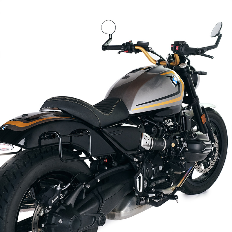 Rechter Rahmen für Taschen mit Schnellkupplung aus Stahl mit mattschwarzer Epoxidpulverbeschichtung.