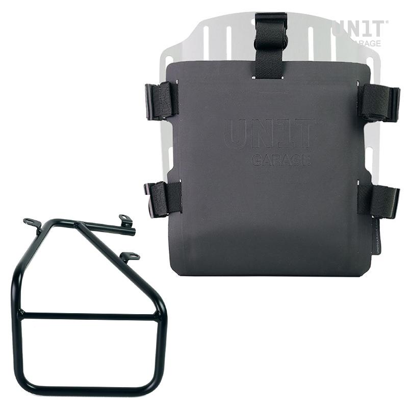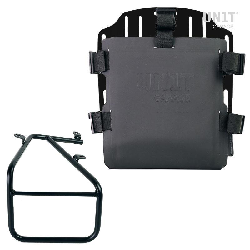 Platte, die mit einem Schloss zum Verriegeln am Rahmen selbst versehen ist. Die Platte bildet eine flache Montagefläche an der Seite des Fahrrads. Dies ermöglicht den Transport von nicht befestigten Taschen oder anderen Gegenständen wie Schlafsäcken, Jacken usw. Die Frontklappe mit den kleinsten Details und Hypalon-Oberflächen kann mit den mitgelieferten Schiebereglern eingestellt und sehr schnell von der Platte entfernt werden.