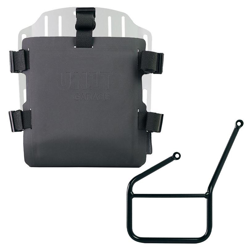 Platte, die mit einem Schloss zum Verriegeln am Rahmen selbst versehen ist. Die Platte schafft eine flache Montagefläche an der Seite des Fahrrads, dies ermöglicht den Transport von nicht befestigten Taschen oder anderen Gegenständen, wie Schlafsäcken, Jacken usw. Die bis ins kleinste Detail gepflegte Frontklappe mit Hypalon-Finish lässt sich über die mitgelieferten Schieber verstellen und sehr schnell von der Platte abnehmen.