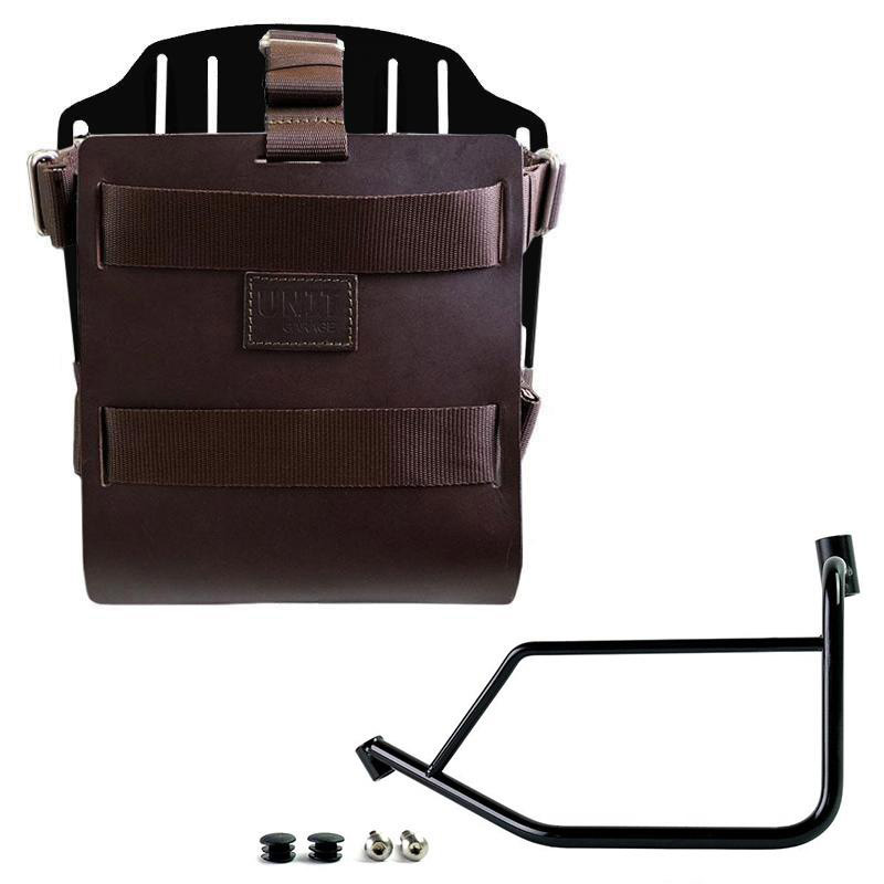 Taschenhalterplatte aus eloxiertem Aluminium mit verstellbarer Lederfront. Mit dem bereits enthaltenen und auf der Rückseite der Platte montierten Schnellverschlusssystem Code U000, das mit einem Schloss zum Verriegeln am Rahmen selbst ausgestattet ist, lässt es sich schnell an unseren Taschenhalterrahmen befestigen. Durch die Platte entsteht eine ebene Montagefläche an der Seite des Motorrads, die den Transport von Taschen ohne Befestigung oder anderen Gegenständen wie Schlafsäcken, Jacken usw. ermöglicht. Die bis ins kleinste Detail durchdachte Frontklappe mit 3-mm-Lederbesatz lässt sich über die mitgelieferten Schieber verstellen und lässt sich sehr schnell von der Platte abnehmen.