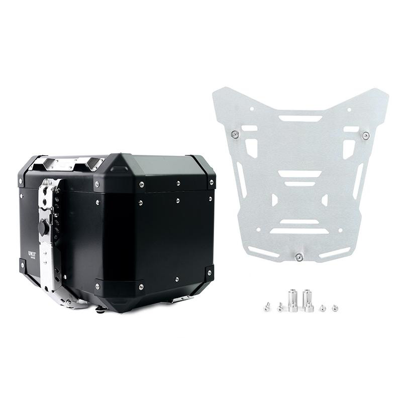 Hergestellt aus 5 mm dickem, schwarz eloxiertem Aluminium, ermöglicht es die Montage unseres Topcase-Codes: AL15_BL auf dem Original-Gepäckträger der BMW R1300GS ADV.