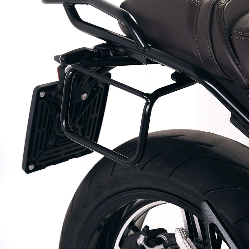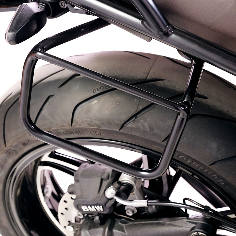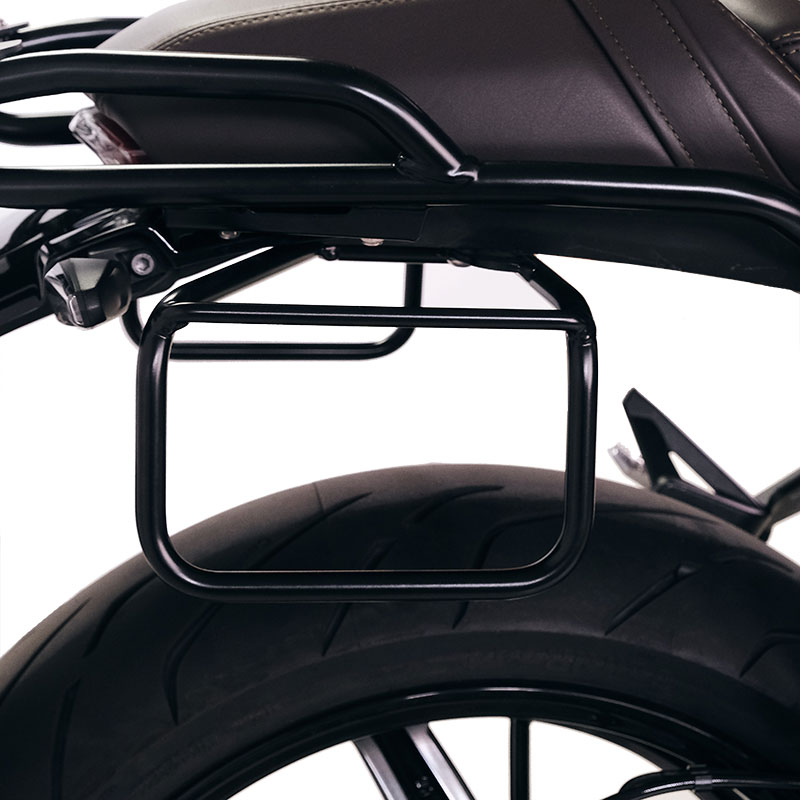 Rechter Rahmen für Taschen mit Schnellkupplung aus Stahl mit mattschwarzer Epoxidpulverbeschichtung.