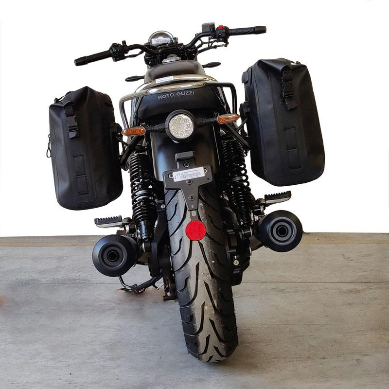 Die Tasche wurde für den Moto Guzzi-Rahmen entwickelt, integriert sich nahtlos in den Rest des Motorrads und besteht aus Stahl mit mattschwarzer Epoxidpulverbeschichtung. Sie ist für unser Schnellverschlusssystem vorbereitet und sieht auch ohne montierte Tasche attraktiv und minimalistisch aus. Sie kann bequem mit einem Beifahrer verwendet werden.