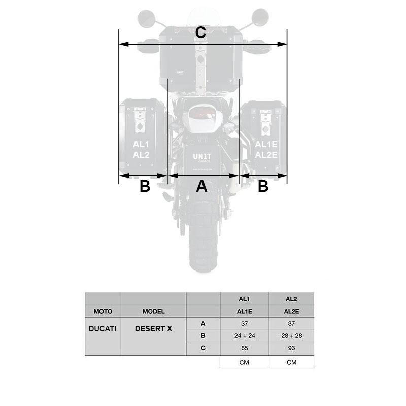 den Ducati DesertX-Modellen. Sie integrieren sich perfekt in den Rest des Fahrrads. Bereit zur Aufnahme unserer Aluminiumtaschen in verschiedenen Größen. Wird komplett mit Montagesatz und Schrauben geliefert. Es kann in Kombination mit unserem Zubehör am Motorrad montiert werden
