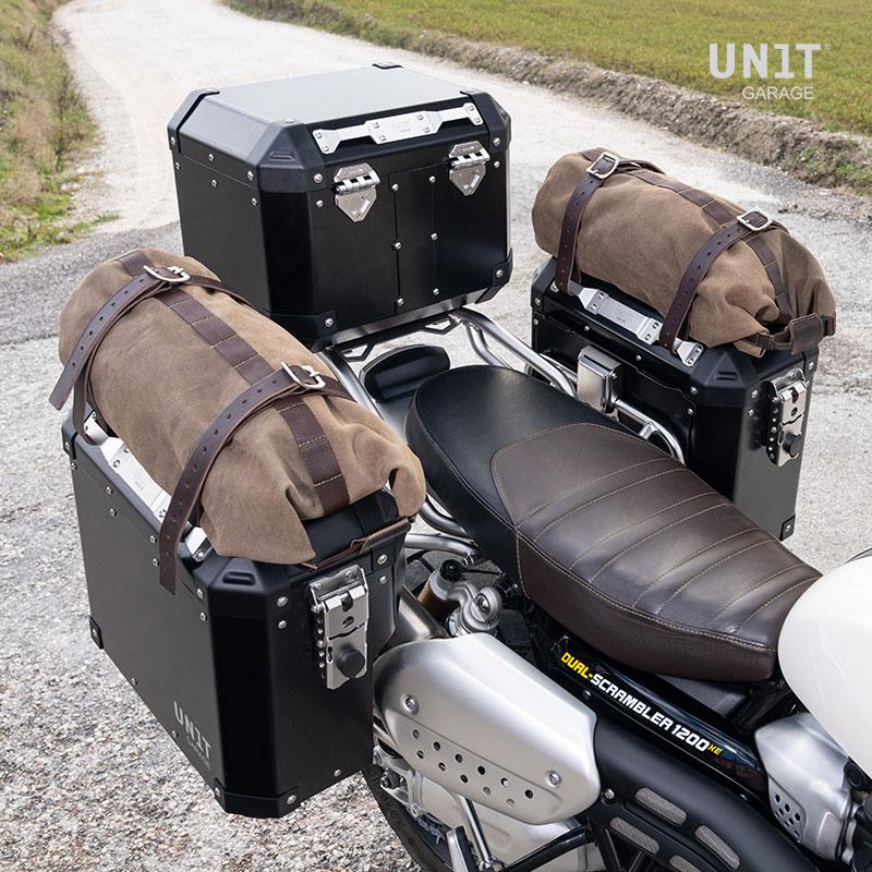 Wir wollten elegante, klassische und robuste Taschen mit schönen Stahlreißverschlüssen und durchdachten Details: Details, die für Abenteuer geschaffen und allen Bedingungen standhalten. Dank des auf der Rückseite der Tasche positionierten Sicherheitsbefestigungssystems werden sie an jedem Rundrohrrahmen mit einem Durchmesser von 18 mm befestigt. Der Verschluss weitet sich automatisch auf, um eine einfache Montage und Demontage vom Taschenrahmen zu ermöglichen. Der Innenhebel ist aus dem Vollen CNC-gefräst Material aus hochwertiger Aluminiumlegierung. Der Deckel lässt sich komplett abnehmen und beidseitig öffnen, er ist innen mit Fixierungen ausgestattet und im Lieferumfang ist ein Gummiband als Halterung für Handschuhe, Dokumente und kleine Gegenstände enthalten. Der Deckelhalter besteht aus Leder mit lösbaren Druckknöpfen. Die Verschlüsse sind so konzipiert, dass zusätzlich zum mitgelieferten ein zusätzliches Vorhängeschloss untergebracht werden kann. Der Taschenkörper ist vollständig mit robustem 2,5-mm-Neopren ausgekleidet, das Stöße abfedert. Die Scharniere, Schlösser und alle Details sind aus Edelstahl gefertigt und elektropoliert, was Sie bei keinem vergleichbaren Produkt auf dem Markt finden werden. Die Ecken bestehen aus stabilem ABS und sind, ebenso wie jedes einzelne Bauteil, im Falle eines Sturzes austauschbar. Unsere Alu-Taschen werden vollständig in Italien hergestellt und einzeln von Hand zusammengebaut.
