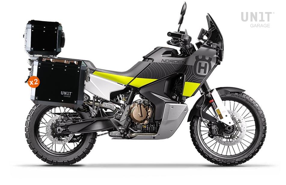 Dieses speziell für die Husqvarna Norden 901 entwickelte Montagesystem wird komplett mit Verstärkungen aus Edelstahlrohr, Stützplatte und entsprechendem Atlas 36L-Topcase geliefert.