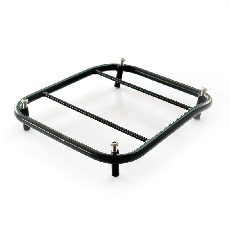 Gepäckträger aus Stahl mit mattschwarzer Epoxy-Pulverbeschichtung.