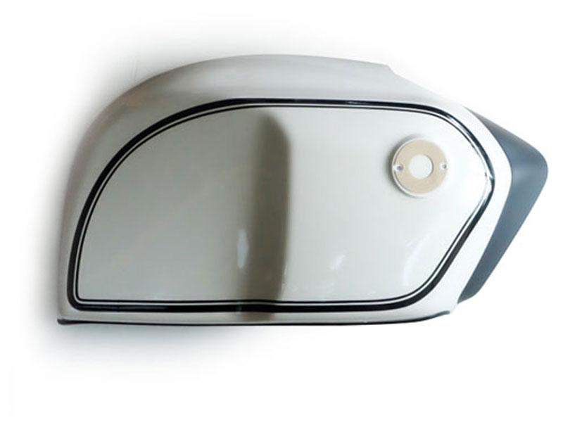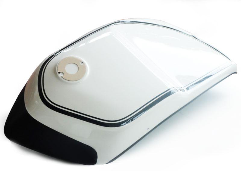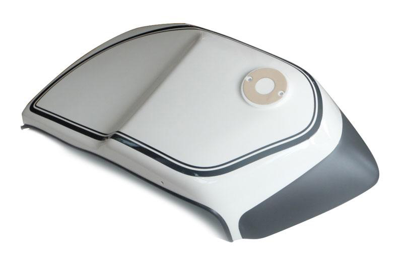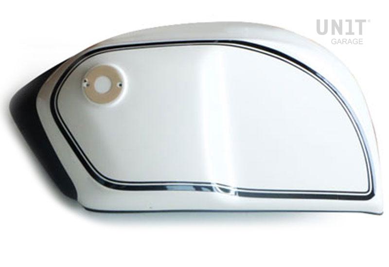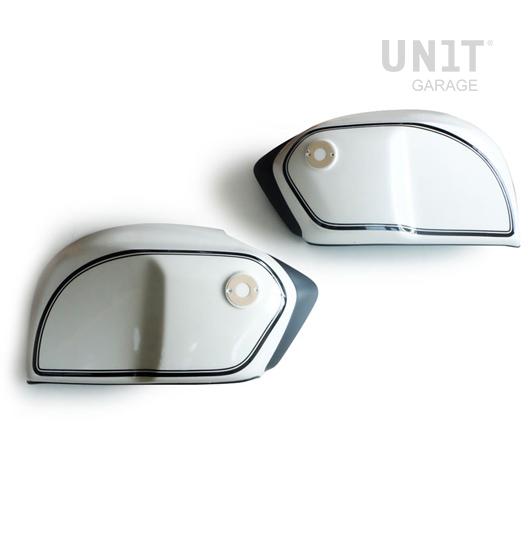 Ein Paar Abdeckungen aus Spezialharz und MAT-Tank mit Kohlefaserverstärkungen, ALPINEWHITE weiß, mit Grafiken und transparentem Schutz.