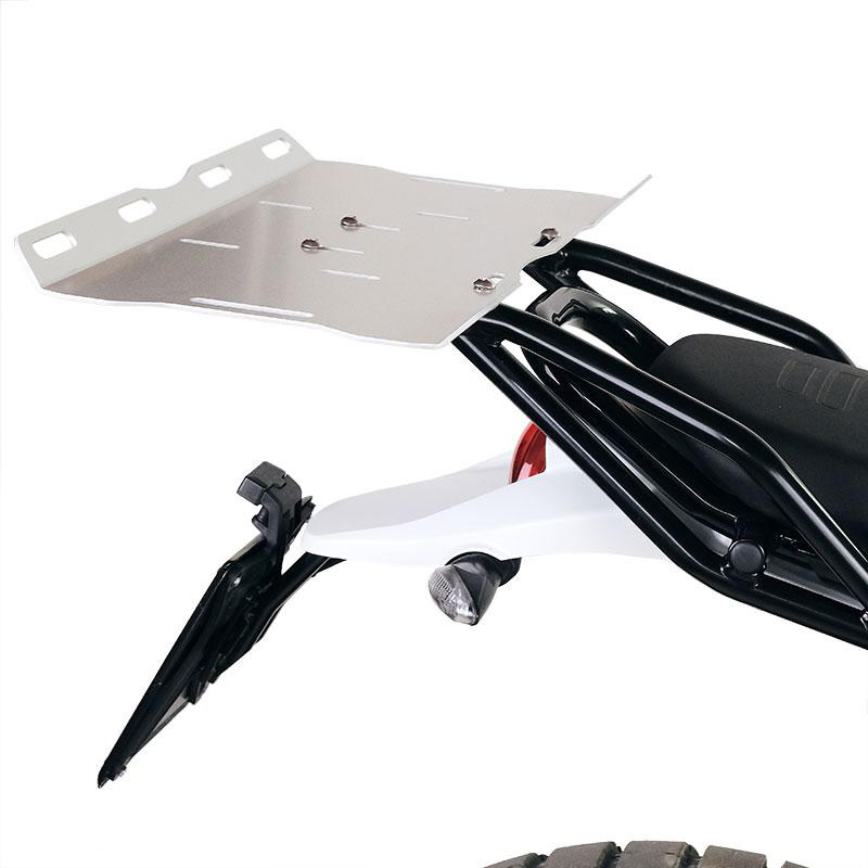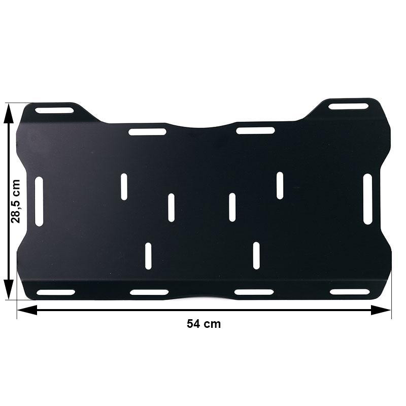 Hergestellt für unsere Gepäckträger mit 4 Befestigungsbuchsen, lässt es sich leicht an jeden Gepäckträger mit einer ebenen Oberfläche anpassen (zur Befestigung an Rohrgepäckträgern ohne 4 Buchsen empfehlen wir 2 Stück, Code: A9). Vergrößert die Ladefläche erheblich und eignet sich perfekt für den Transport von Reisetaschen, Rolltaschen, Campingzelten und Taschen im Allgemeinen. Es ist mit Kanten und großen Ösen zur Befestigung von Riemen wie unserem Code: UG008 oder Code: U110 ausgestattet. Er besteht aus silber oder schwarz eloxiertem Aluminium, hat eine Dicke von 3 mm und eine maximale empfohlene Belastung von 6 kg: Wir empfehlen Ihnen, die Belastung gleichmäßig auf dem Fahrrad zu verteilen, indem Sie Seitentaschen, Tankrucksäcke usw. anbringen, ohne zu übertreiben Die Hecklast kann sich negativ auf die Fahrbarkeit Ihres Motorrads auswirken